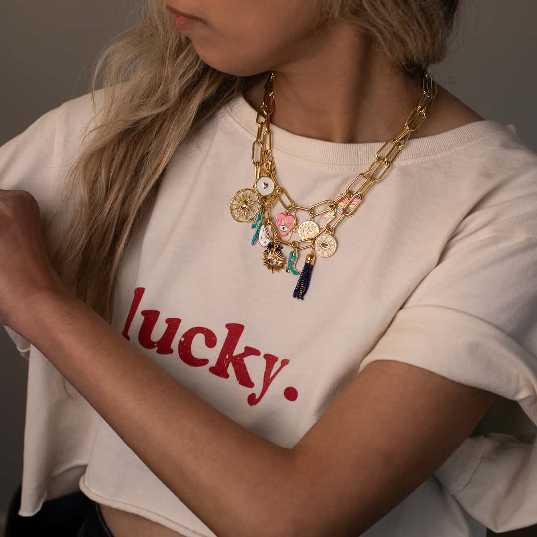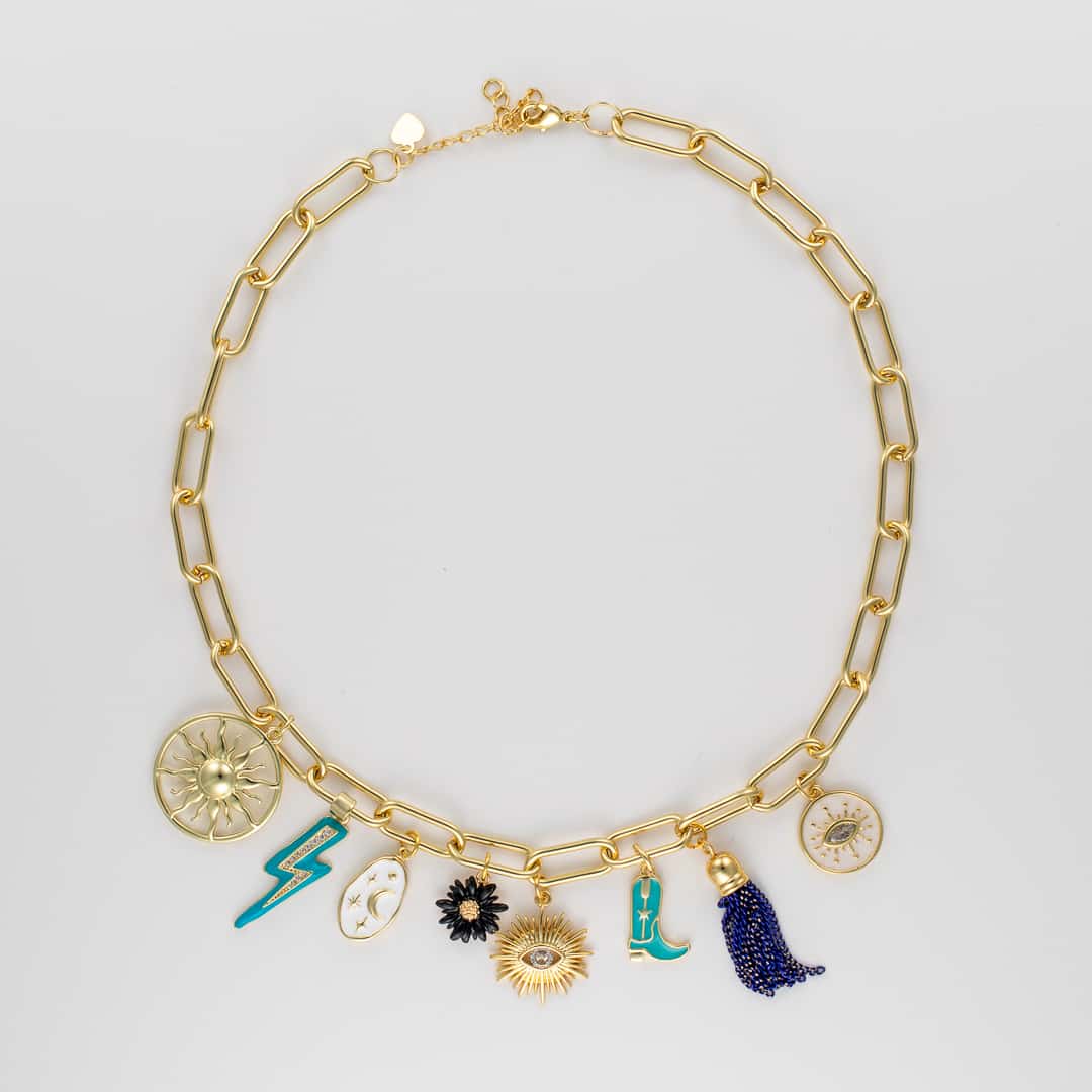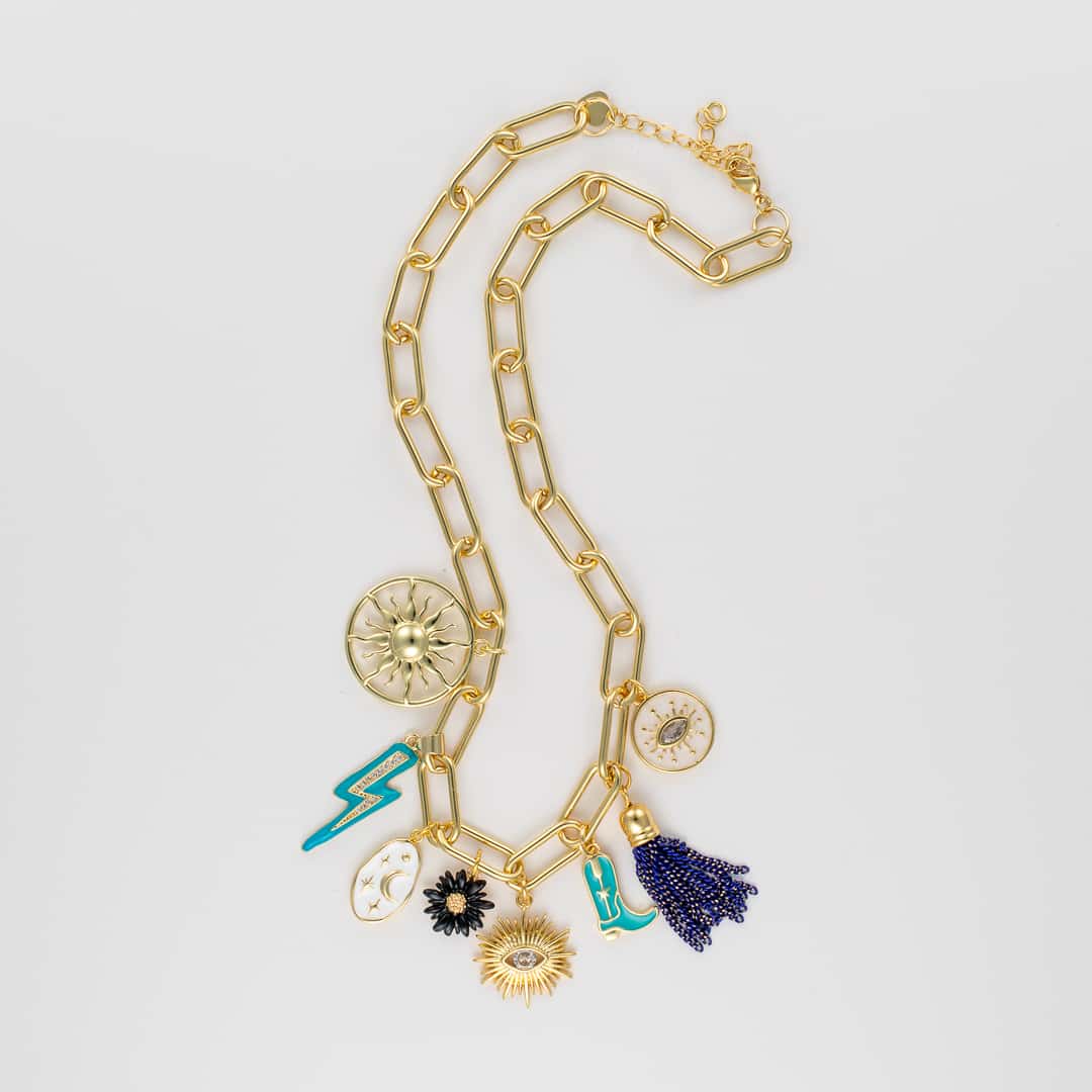 Perfect for the free spirits, Spirited is a symbol of independence and unstoppable drive. Made with gold-plated charms on an 18K gold-plated chain. ⚡☀️🤠